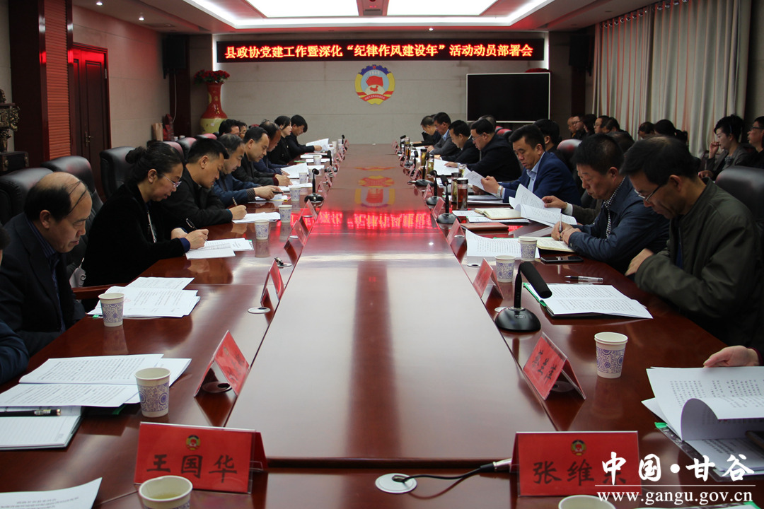 縣政協(xié)黨組書記、主席馬驥出席會(huì)議并講話;縣政協(xié)副主席董成斌主持會(huì)議;縣政協(xié)副主席董德福宣讀《甘谷縣政協(xié)深化“紀(jì)律作風(fēng)建設(shè)年”活動(dòng)實(shí)施方案》;縣政協(xié)副主席田小龍、馬清平、郭長(zhǎng)勝出席會(huì)議。