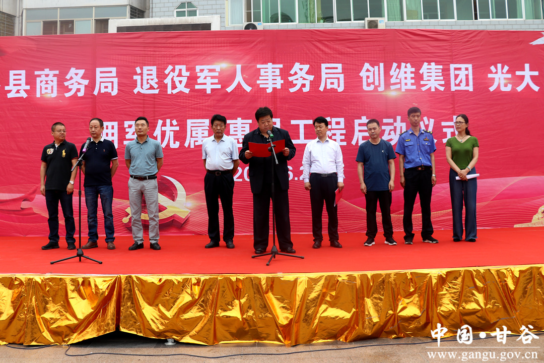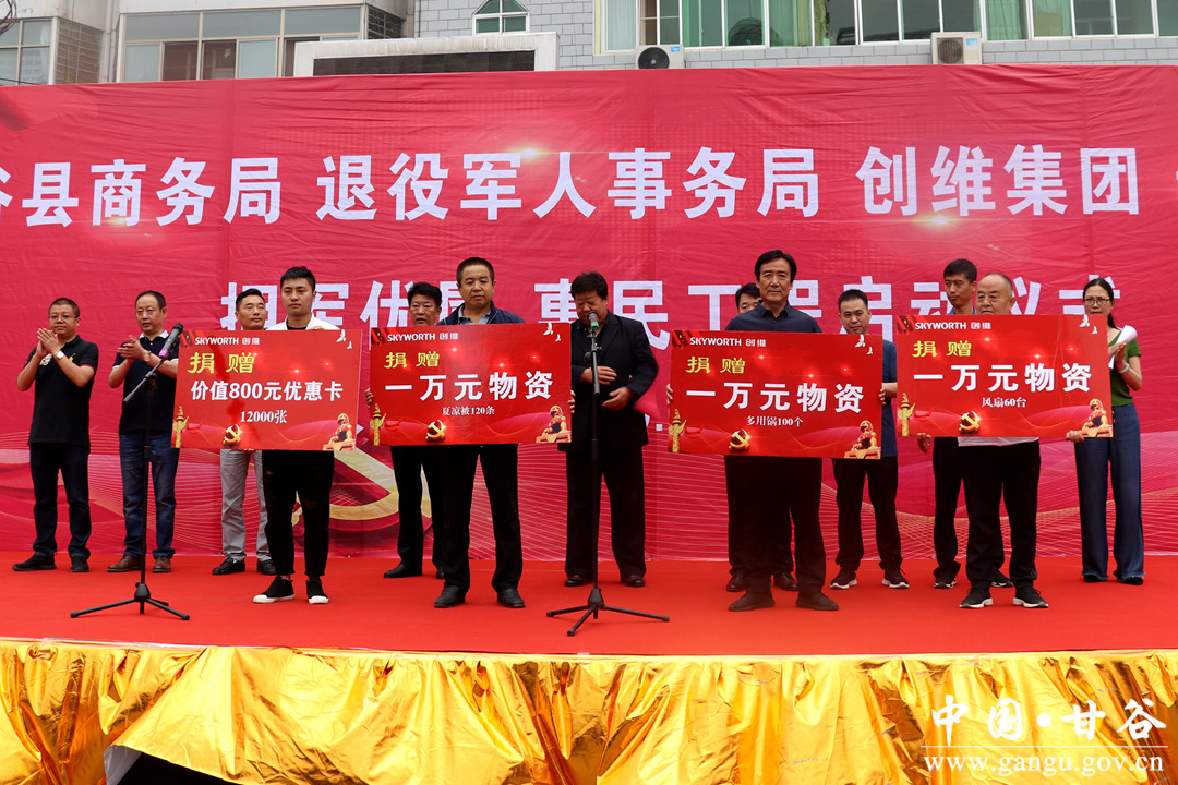 6月26日,甘谷縣光大家電“擁軍優(yōu)屬、惠民工程”活動啟動儀式,縣政府辦、商務局、退役軍人事務局、縣融媒體中心及甘谷縣光大家電有限公司、創(chuàng)維蘭州分公司、美的蘭州分公司、奧馬蘭州分公司等負責人、退役軍人及家屬代表共計200余人在大什字廣場參加了啟動儀式。