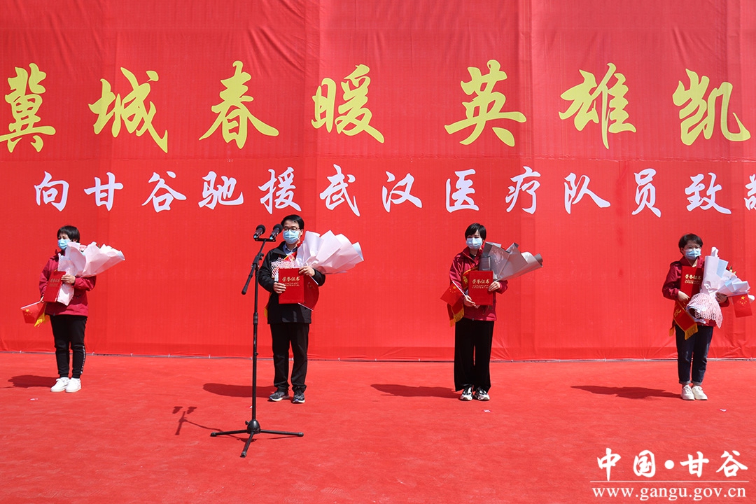 吳健在講話中代表縣四大組織和64萬(wàn)全縣人民,向4位英雄平安回家表示熱烈的歡迎,對(duì)他們近50天的英勇奮戰(zhàn)表示衷心的感謝,并向默默支持、辛勞付出的醫(yī)護(hù)人員家屬表示崇高的敬意!他說,面對(duì)突如其來的新冠肺炎疫情,你們4位作為甘肅援鄂醫(yī)療隊(duì)成員,代表甘谷積極響應(yīng)中央和省市委的號(hào)召,主動(dòng)請(qǐng)纓、逆行出征,舍小家、顧大家,遠(yuǎn)離需要照顧的父母,遠(yuǎn)離需要關(guān)心的孩子,帶著甘谷人民的囑托,帶著使命、帶著責(zé)任、帶著感情,義無(wú)反顧沖向武漢抗疫第一線,與武漢人民并肩作戰(zhàn),與新冠病毒正面交鋒。當(dāng)前,全國(guó)疫情防控形勢(shì)持續(xù)向好,武漢抗疫阻擊戰(zhàn)取得決定性勝利,今天你們圓滿完成任務(wù),平安回來,我們感到無(wú)比自豪和驕傲。你們的付出,充分展現(xiàn)了醫(yī)者仁心的崇高精神,充分詮釋了明理重義、吃苦耐勞、樂于奉獻(xiàn)的甘谷精神,你們是最美逆行者,是當(dāng)之無(wú)愧的“最美天水人”,更是新時(shí)代的最美抗疫英雄!