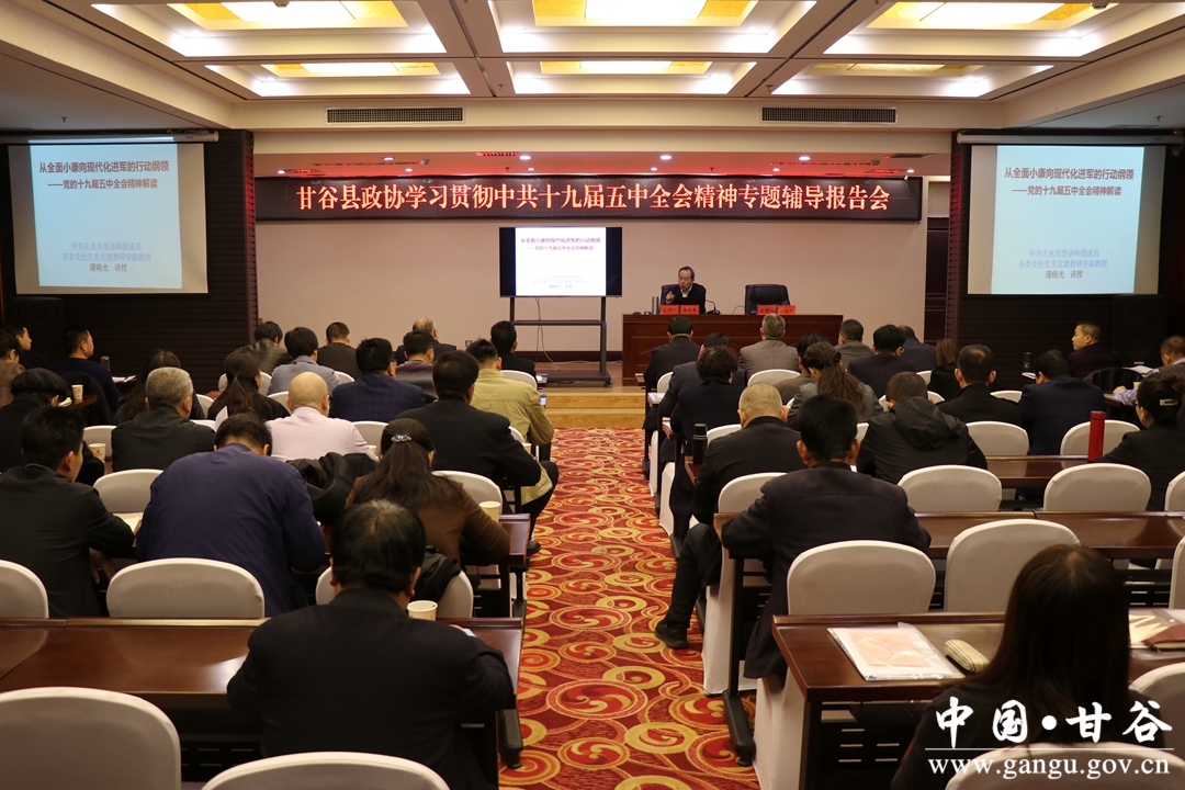 3月22日下午,甘谷縣政協(xié)舉行學習貫徹黨的十九屆五中全會精神專題輔導報告會。邀請市委講師團成員、市委黨校黨史黨建教研室副教授蒲曉光作宣講報告?h政協(xié)主席馬驥,縣政協(xié)副主席董德福、蔣文,縣政協(xié)機關(guān)全體干部職工及部分政協(xié)委員共計110余人聆聽報告?h政協(xié)副主席馬清平主持報告會。