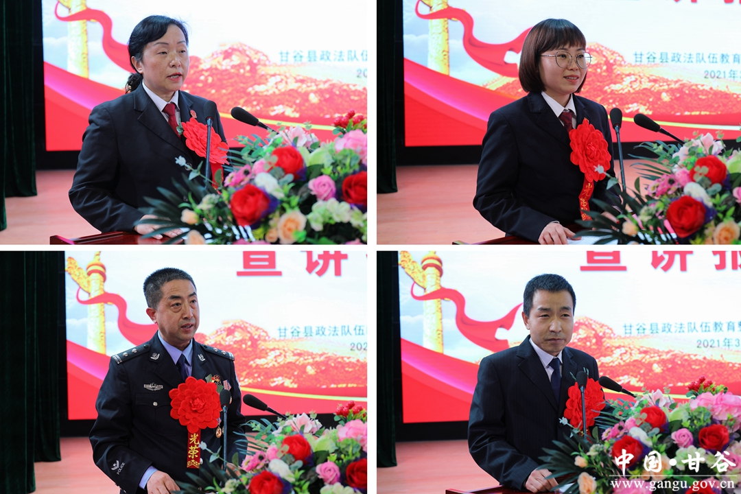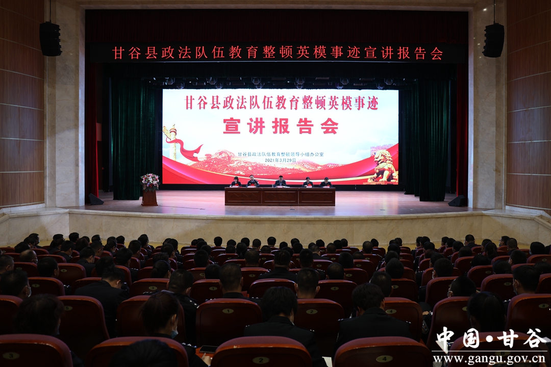 按照全縣政法隊(duì)伍教育整頓學(xué)習(xí)教育環(huán)節(jié)部署要求,3月29日下午,甘谷縣舉行政法隊(duì)伍教育整頓英模事跡宣講報(bào)告會?h委常委、政法委書記、縣政法隊(duì)伍教育整頓領(lǐng)導(dǎo)小組常務(wù)副組長馬福勝,縣法院院長、縣政法隊(duì)伍教育整頓領(lǐng)導(dǎo)小組副組長王建軍,縣檢察院檢察長、縣政法隊(duì)伍教育整頓領(lǐng)導(dǎo)小組副組長姜云出席報(bào)告會。副縣長、縣公安局局長、縣政法隊(duì)伍教育整頓領(lǐng)導(dǎo)小組副組長張濤主持報(bào)告會;縣政法隊(duì)伍教育整頓領(lǐng)導(dǎo)小組成員單位負(fù)責(zé)人,各鄉(xiāng)鎮(zhèn)政法委員、綜治中心主任,全縣政法系統(tǒng)干警、干部,縣鐵路護(hù)路聯(lián)防巡查隊(duì)員、線格員共計(jì)500余人參加報(bào)告會。