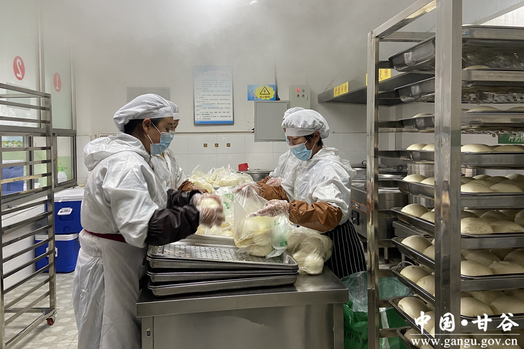在甘谷縣博優(yōu)餐飲中央廚房有限公司的生產(chǎn)車間里,工作人員正忙著包裝饅頭、榨菜等愛心物資,這些東西將第一時間送往城區(qū)各個疫情防控點(diǎn)。
