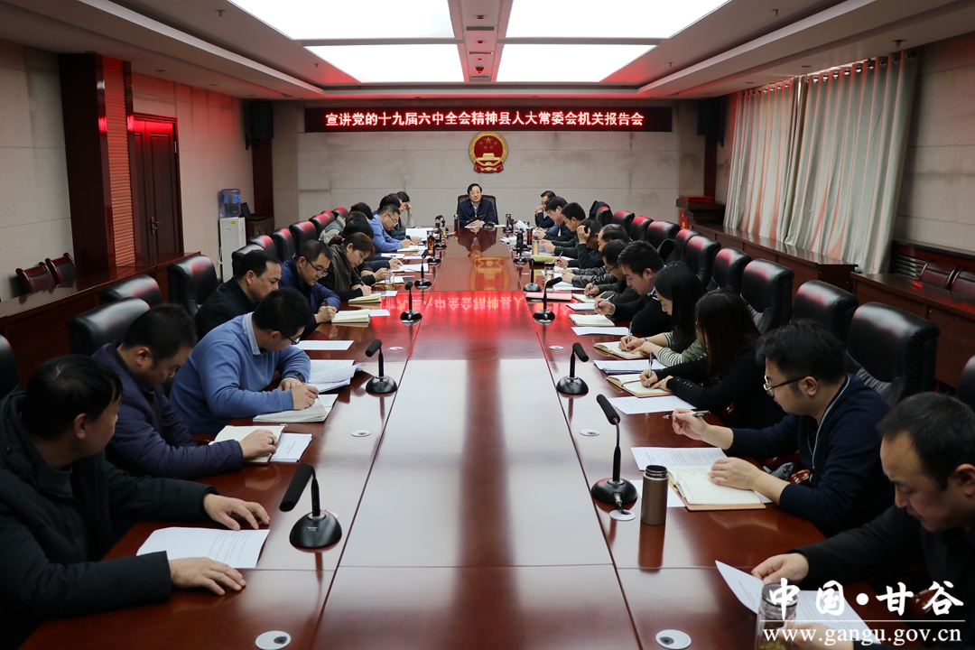 12月29日,甘谷縣人大常委會(huì)黨組書記、主任楊帆在縣人大常委會(huì)機(jī)關(guān)專題宣講黨的十九屆六中全會(huì)精神。縣人大常委會(huì)副主任陳旭、王新民、楊曉濤、董寶玉,縣人大機(jī)關(guān)全體干部參加宣講會(huì)。