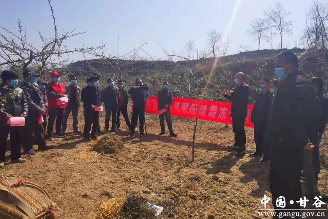 連日來(lái),甘谷縣果品產(chǎn)業(yè)服務(wù)中心組織農(nóng)技人員深入各鄉(xiāng)鎮(zhèn)果園,指導(dǎo)果農(nóng)采取有效防護(hù)措施,及時(shí)開(kāi)啟果園“抗霜抗凍”模式。