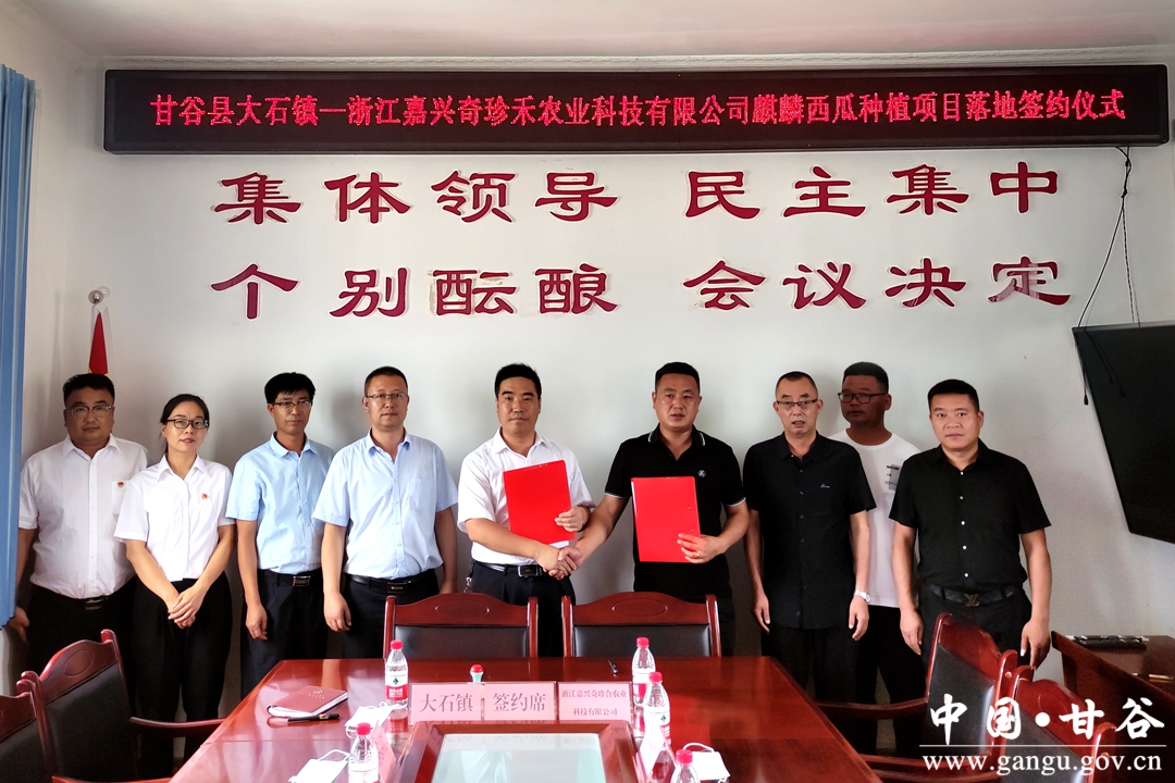 簽約儀式上,大石鎮(zhèn)黨委副書(shū)記、鎮(zhèn)長(zhǎng)蔣東明與浙江嘉興奇珍禾農(nóng)業(yè)科技有限公司經(jīng)理李林軍簽訂《甘谷縣大石鎮(zhèn)—浙江嘉興奇珍禾農(nóng)業(yè)科技有限公司麒麟西瓜種植項(xiàng)目合作框架性協(xié)議書(shū)》。據(jù)了解,本次簽約項(xiàng)目主要在大石鎮(zhèn)大石村、貫寺村、牛川村、王川村、河南村等清溪河流域流轉(zhuǎn)土地3000畝建設(shè)麒麟西瓜種植基地,同時(shí)輻射帶動(dòng)周邊農(nóng)戶加入種植聯(lián)盟發(fā)展麒麟西瓜產(chǎn)業(yè)2000畝以上,計(jì)劃總投資8200萬(wàn)元。采取“公司+基地+農(nóng)戶”經(jīng)營(yíng)模式,堅(jiān)持集約化、標(biāo)準(zhǔn)化生產(chǎn)與初加工發(fā)展方向,以種植、分揀為主,打造從育苗生產(chǎn)到終端銷售的完整產(chǎn)業(yè)鏈。