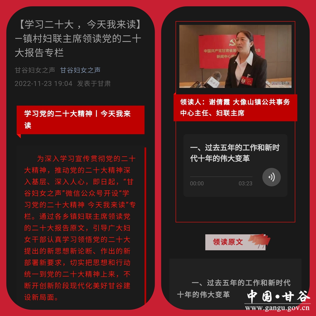 四、引導(dǎo)婦女“自我”學(xué)。依托“甘谷婦女之聲”公眾號平臺,積極向廣大婦女推送主流媒體和新媒體黨的二十大學(xué)習(xí)資源,推送名家教授解析、權(quán)威理論文章和各類報刊社評。同時開設(shè)“學(xué)習(xí)二十大 今天我來讀”專欄,暢通個人自學(xué)渠道,鼓勵廣大婦女群眾運用學(xué)習(xí)強(qiáng)國APP、甘谷黨建APP、新甘谷APP、電視等婦女喜聞樂見的媒體平臺展開自學(xué)。