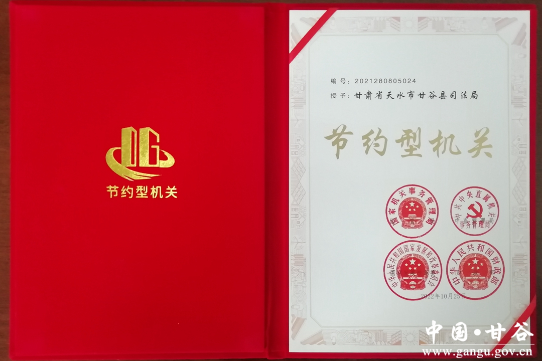 2022年,國家機(jī)關(guān)事務(wù)管理局、中共中央直屬機(jī)關(guān)事務(wù)管理局、國家發(fā)展和改革委員會、中華人民共和國財政部聯(lián)合公布一批節(jié)約型機(jī)關(guān)建成單位名單。甘谷縣司法局在此次評選中被授予“節(jié)約型機(jī)關(guān)”榮譽(yù)稱號。