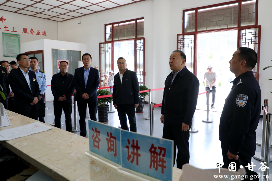 在大像山景區(qū)服務(wù)中心,吳健詢問當(dāng)前游客流量,了解應(yīng)急預(yù)案、高峰限流等情況。他強(qiáng)調(diào),今年“五一”是疫情防控平穩(wěn)轉(zhuǎn)段后的首個(gè)小長假,人流、客流相對集中,要強(qiáng)化隱患排查整治,完善配套設(shè)施,扎實(shí)做好游客疏導(dǎo)、志愿服務(wù)、市場監(jiān)管及景區(qū)周邊交通組織、秩序維護(hù)等工作,以更好的環(huán)境、更優(yōu)質(zhì)的服務(wù)、更高質(zhì)量的旅游產(chǎn)品、更豐富的內(nèi)容,努力提升游客舒適度體驗(yàn)感,確保廣大游客在甘谷玩得開心、住得舒心、游得放心。