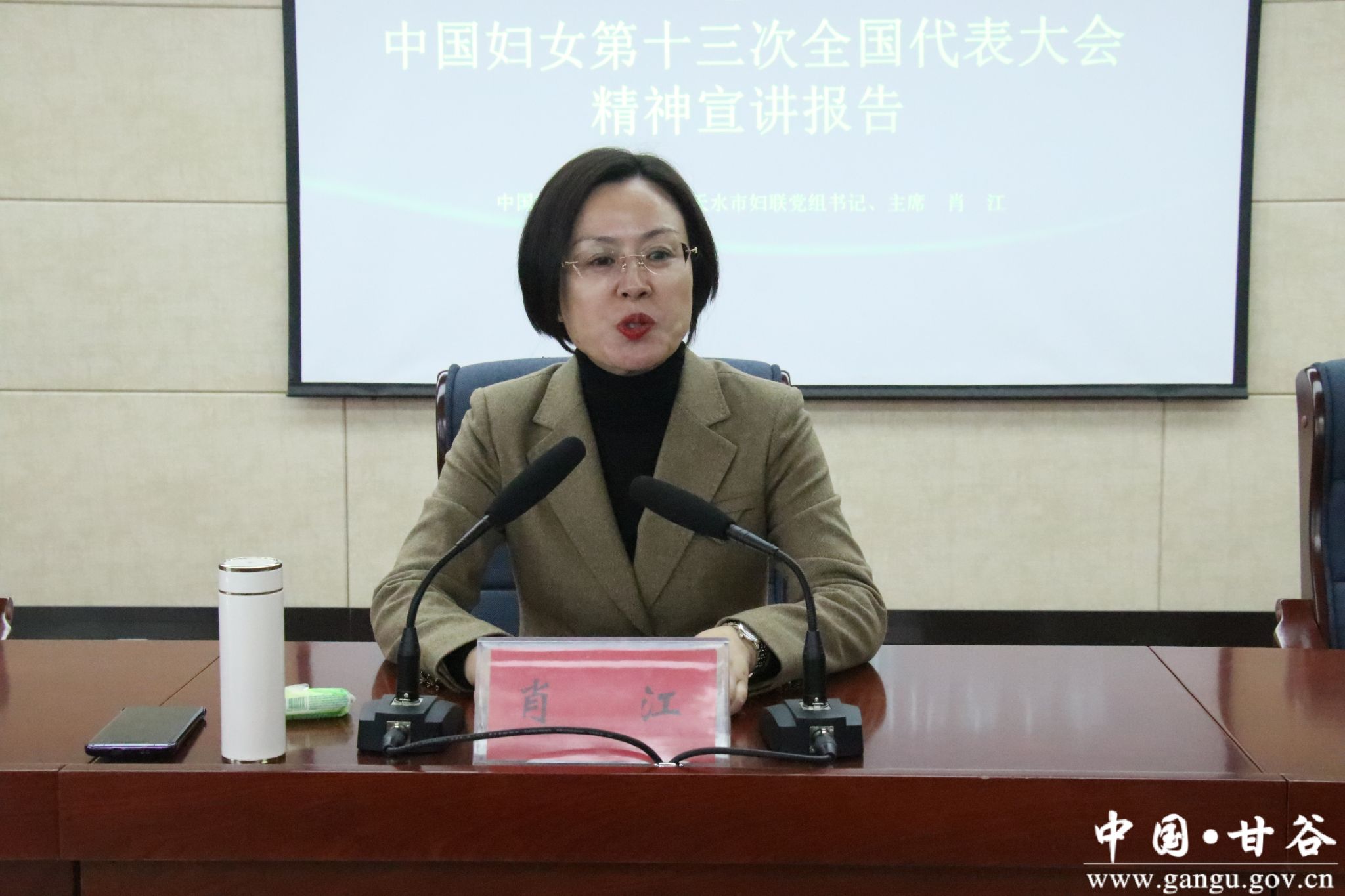 為深入學(xué)習(xí)宣傳貫徹中國婦女第十三次全國代表大會精神,推動學(xué)習(xí)宣傳貫徹大會精神走進(jìn)千家萬戶、走進(jìn)廣大婦女群眾,切實把大會精神轉(zhuǎn)化為推動婦女兒童事業(yè)高質(zhì)量發(fā)展的實際行動,11月16日,甘谷縣召開中國婦女十三大精神宣講大會,中國婦女十三大代表、天水市婦聯(lián)黨組書記、主席肖江作專題宣講?h委副書記許祖熙主持大會,各鄉(xiāng)鎮(zhèn)、村(社區(qū))婦聯(lián)主席、副主席、執(zhí)委、婦女干部、致富帶頭人代表、巾幗志愿者代表、各縣直單位婦委會主任等共計200余人參加活動。