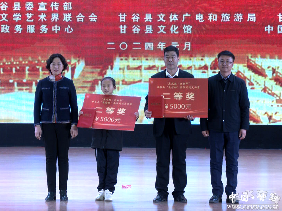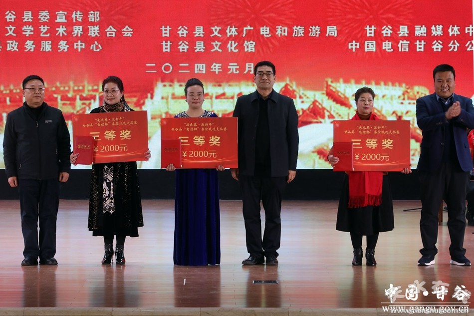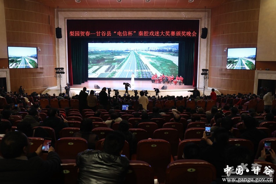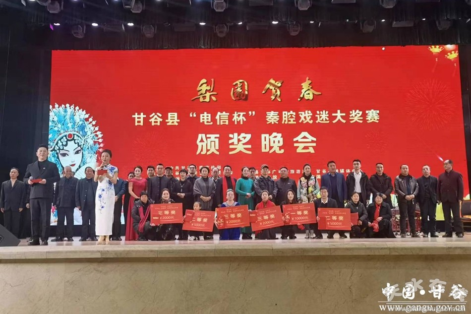 新甘谷訊【記者謝映波】1月4日,甘谷縣舉辦“電信杯”秦腔戲迷大獎(jiǎng)賽頒獎(jiǎng)晚會(huì)。縣委常委、宣傳部部長(zhǎng)范慧出席并致辭?h人大常委會(huì)副主任楊曉濤、副縣長(zhǎng)曲遠(yuǎn)風(fēng)、縣政協(xié)副主席李文定為獲獎(jiǎng)選手頒獎(jiǎng)。