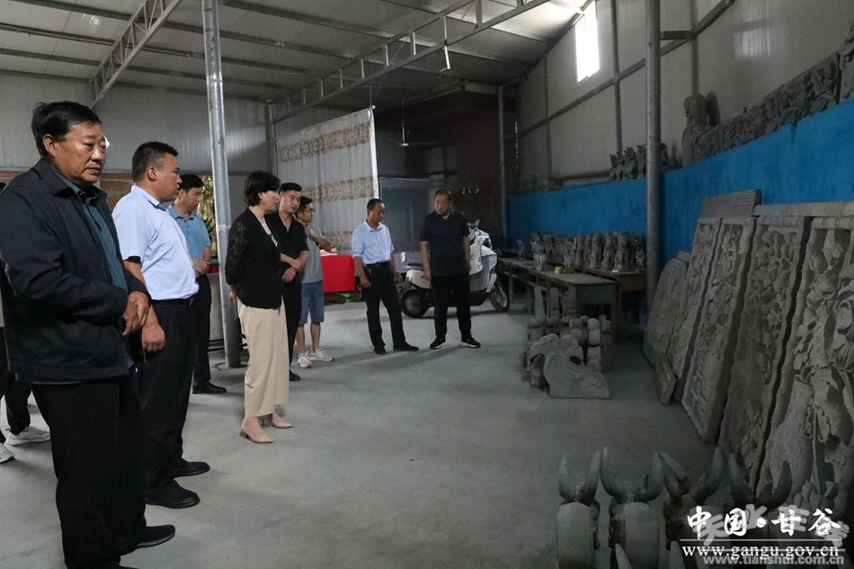 調研組先后來到新興鎮(zhèn)永安村、新安大道非遺文創(chuàng)園、雅路人麻編鞋業(yè)有限公司、縣文化館,對甘谷脊獸、甘谷木雕以及甘谷麻鞋等縣域重點非物質文化遺產的傳承保護情況進行實地考察。每到一處,調研組都與各非遺代表性項目傳承人進行深入交流,詳細了解其在發(fā)展過程中面臨的困難與瓶頸,并提出針對性的意見和建議。