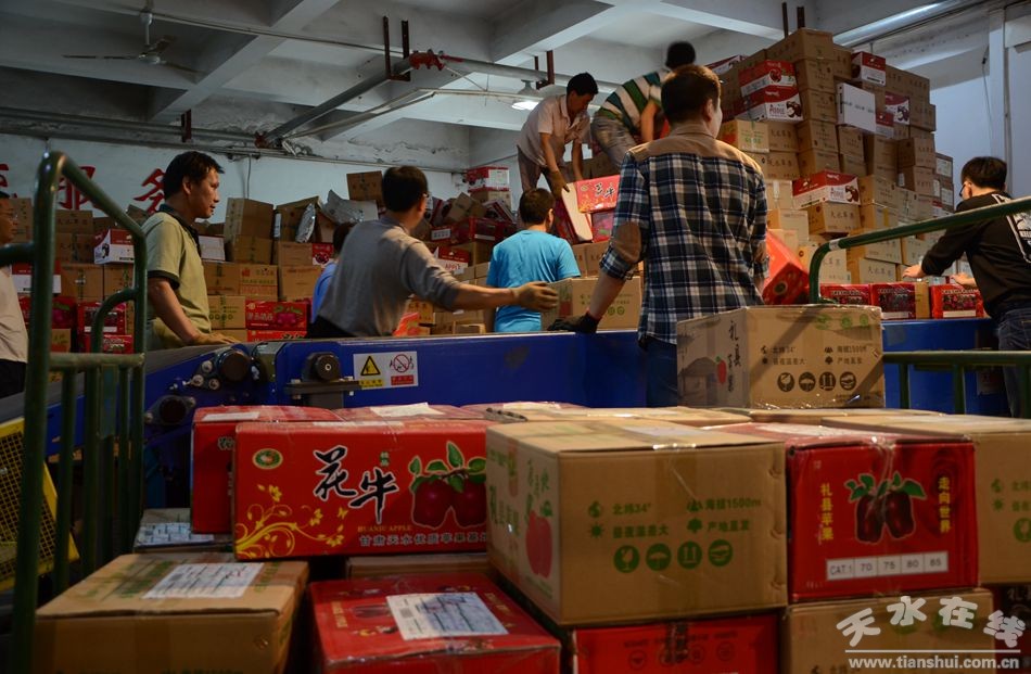 隨著9月份天水“花!碧O果成熟季的到來,由全市各蘋果園采摘,經(jīng)郵政分所收貨、運(yùn)送至天水市郵件處理中心的“花牛”,不斷刷新著分發(fā)轉(zhuǎn)運(yùn)車間的記錄。每天,郵件處理中心幾十名員工,要在山包一樣的“花牛”貨箱夾縫中,完成卸車、碼貨、裝車的搬運(yùn)。為了應(yīng)對(duì)蜂擁而至的“花牛”,郵政系統(tǒng)的黨員干部也加入到搬運(yùn)大軍中。目前,全市每天有200多名郵政系統(tǒng)員工在搬運(yùn)“花牛”。