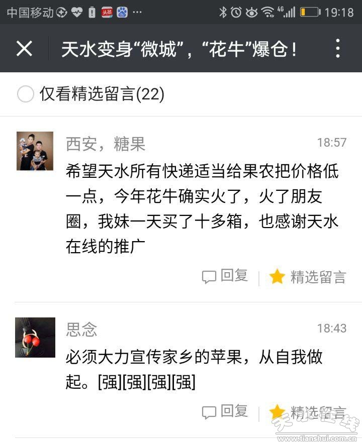 隨著天水在線使出渾身解數(shù),持續(xù)半年多,全力以赴對(duì)“煙鋪模式”的宣傳和推廣,市委市政府領(lǐng)導(dǎo)親自參加“煙鋪果農(nóng)微信直銷自家大櫻桃活動(dòng)夜校開班儀式和啟動(dòng)儀式”、“袁丫丫公益代言清水青皮核桃微信直銷活動(dòng)啟動(dòng)儀式”,并帶頭在朋友圈進(jìn)行轉(zhuǎn)發(fā),同時(shí)親自撰文推廣“煙鋪模式”,在全市范圍內(nèi)營造了濃厚的微商氛圍。隨著,全市普遍種植的“花牛”蘋果的成熟上市,大批村民變身微商,親自上陣,通過微信叫賣,身在城市的市民也為老家的鄉(xiāng)親們搖旗吶喊,在朋友圈轉(zhuǎn)發(fā)。金秋9月,碩果累累,天水人的微信朋友圈變成了“花!碧O果圈,天水變成了一座名副其實(shí)的“微城”。