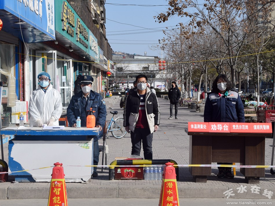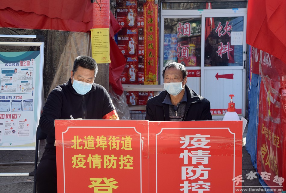 ▲麥積區(qū)羲皇社區(qū)居民防控點(diǎn):北道埠街道辦事處武裝部長(zhǎng)霍世杰、北道埠街道辦事處羲皇社區(qū)干部王亮