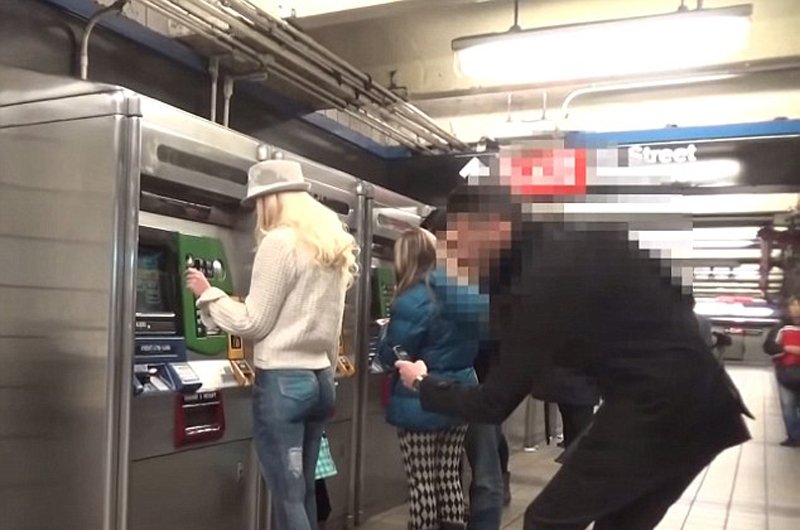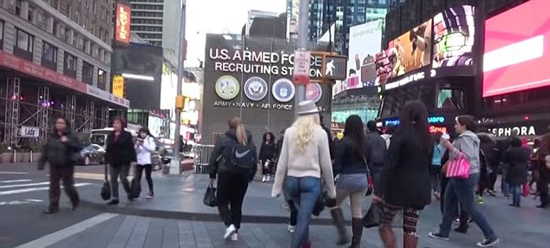 榮格在時代廣場上下臺階,但并未有人注意到她。(網(wǎng)頁截圖)