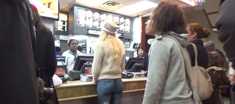 當榮格出現(xiàn)在紐約街頭時,攝影人員跟在后面拍攝人們對榮格“牛仔褲”的反應。(網(wǎng)頁截圖)