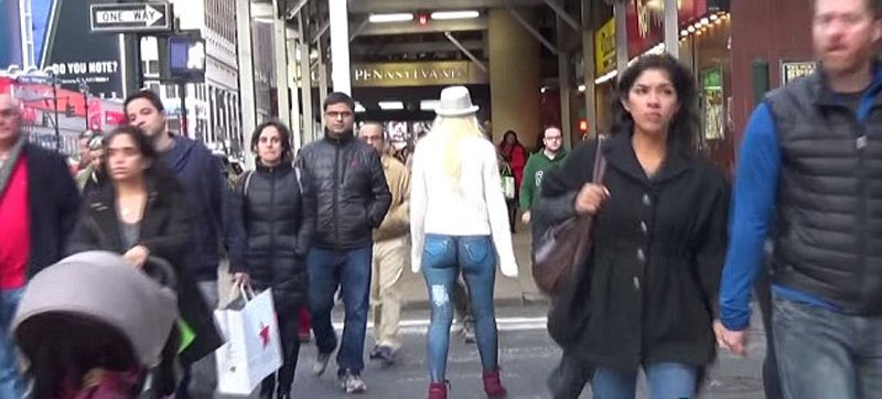 據(jù)英國《每日郵報》11月14日報道,美國女模利亞·榮格(Leah Jung)下身畫著彩繪“牛仔褲”、半裸逛紐約曼哈頓街頭進行社會實驗,竟然幾乎無人發(fā)現(xiàn)。該視頻近日在網(wǎng)上走紅。 藝術家為榮格人體彩繪的“牛仔褲”看起來十分逼真,就連褲縫和時髦的補丁都栩栩如生。此項實驗是為檢測紐約人的觀察力,結果顯示,紐約人似乎對此不太關注。