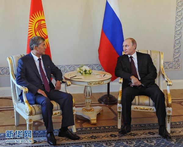 俄總統(tǒng)弗拉基米爾·普京16日在圣彼得堡會見吉爾吉斯斯坦總統(tǒng)阿坦巴耶夫。