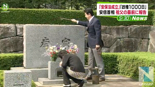據(jù)日本《產(chǎn)經(jīng)新聞》9月22日?qǐng)?bào)道,日本首相安倍晉三22日前往靜岡縣小山町為外祖父岸信介掃墓。他向外祖父報(bào)告了解禁集體自衛(wèi)權(quán)的安全保障相關(guān)法案在國(guó)會(huì)通過(guò)的消息。