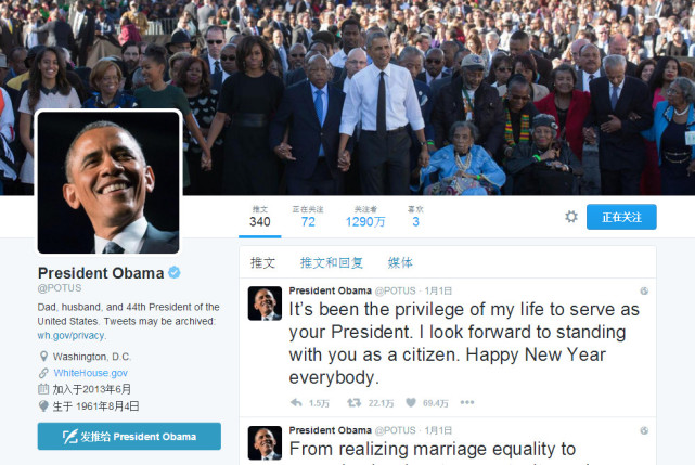 特朗普將在1月20日宣誓就任總統(tǒng),這也意味著奧巴馬的任期還有不足3周時(shí)間。白宮表示,奧巴馬目前使用的推特賬號(hào)將轉(zhuǎn)給下任總統(tǒng)特朗普,奧巴馬的推文將轉(zhuǎn)移至新賬號(hào)保留,新賬號(hào)將在他卸任后啟用。