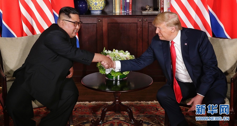 6月12日,朝鮮最高領(lǐng)導(dǎo)人金正恩(左)與美國總統(tǒng)特朗普在新加坡舉行會(huì)晤。 新華社發(fā)(新加坡通訊及新聞部供圖)
