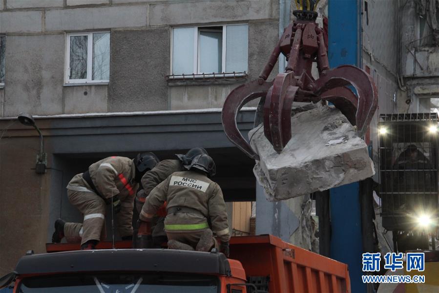 1月2日,在俄羅斯馬格尼托哥爾斯克市,應(yīng)急人員在爆炸事故現(xiàn)場(chǎng)工作。 新華社/衛(wèi)星社
