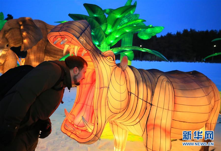 2月14日,在白俄羅斯首都明斯克,一名男子觀看河馬造型的燈飾。當(dāng)日,自貢燈會在明斯克的中央植物園開幕。本次燈會共展出28組不同造型的燈飾,將持續(xù)至3月底。新華社發(fā)(馬祖列維奇攝)