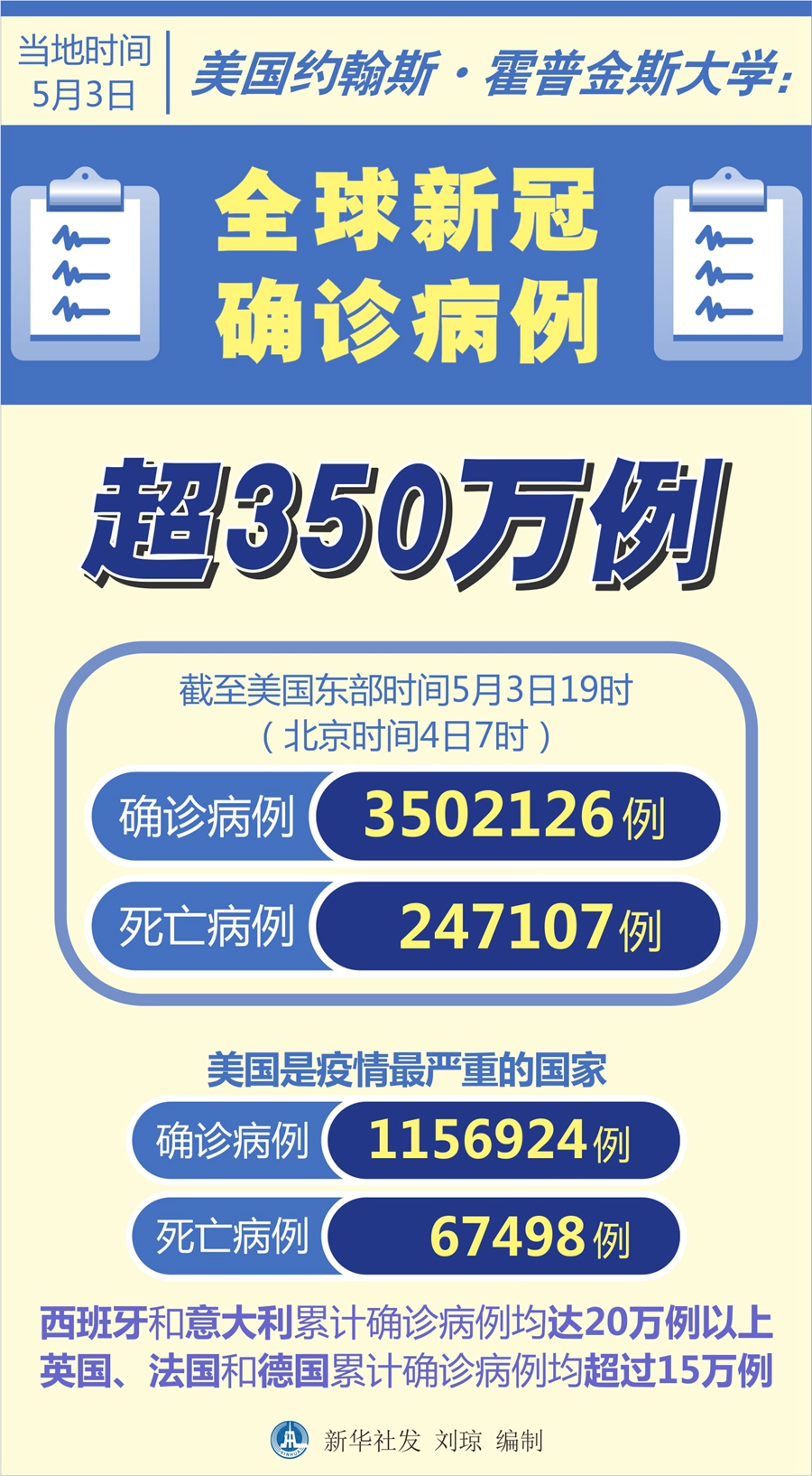 新華社紐約5月3日電 美國約翰斯·霍普金斯大學(xué)3日發(fā)布的新冠疫情最新統(tǒng)計(jì)數(shù)據(jù)顯示,全球累計(jì)確診病例超過350萬例。