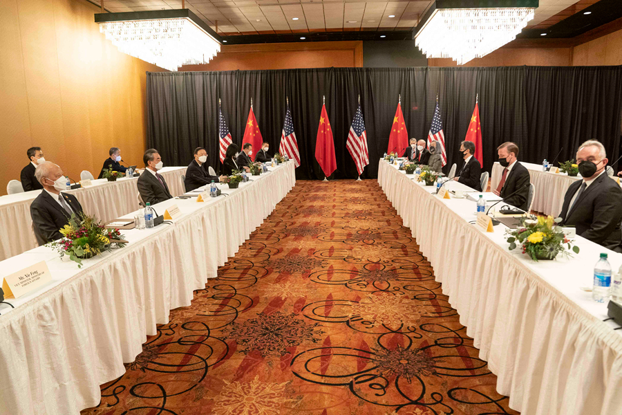 3月18日,中共中央政治局委員、中央外事工作委員會(huì)辦公室主任楊潔篪、國(guó)務(wù)委員兼外長(zhǎng)王毅在安克雷奇同美國(guó)國(guó)務(wù)卿布林肯、總統(tǒng)國(guó)家安全事務(wù)助理沙利文舉行中美高層戰(zhàn)略對(duì)話。楊潔篪、王毅在中美高層戰(zhàn)略對(duì)話開場(chǎng)白中闡明中方有關(guān)立場(chǎng)。新華社記者 劉杰 攝