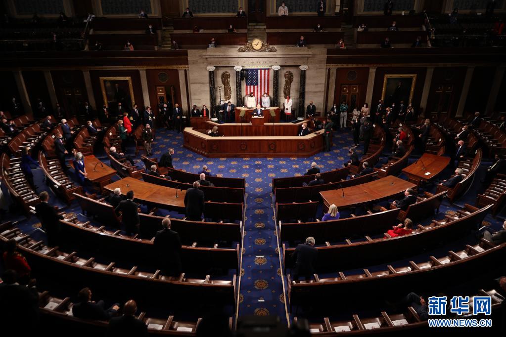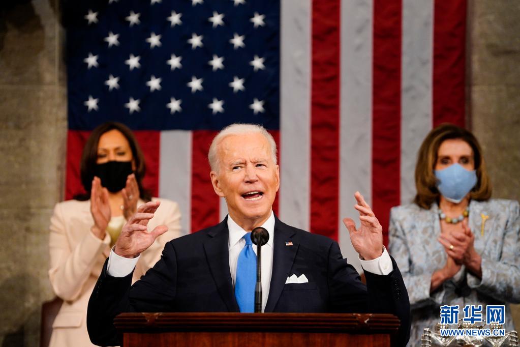 4月28日,美國總統(tǒng)拜登在首都華盛頓的國會發(fā)表演講。新華社發(fā)(Pool圖片,奇普·索莫德維利亞攝)
