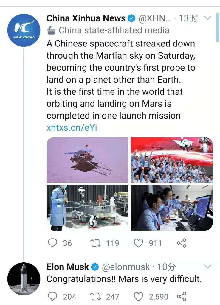 在新華社海外社交媒體報道頁面,美國太空探索技術(shù)公司創(chuàng)始人埃隆·馬斯克留言:“祝賀!去火星是非常困難的。”(記者:張曉茹、魯金博、陳晨、于濤;編輯:羅國芳、欒海、馮玉婧、劉軍、唐志強) |