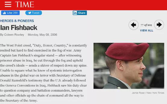 2006年,他因在2005年時寫信揭發(fā)了美軍在伊拉克存在的惡劣虐囚行為,進(jìn)而推動了美國在反虐囚方面的立法,獲得了美國輿論的廣泛稱贊。下圖中的美國《時代》周刊,還在2006年時將他列為了當(dāng)年的100大風(fēng)云人物,稱他為“英雄”和“先驅(qū)”。