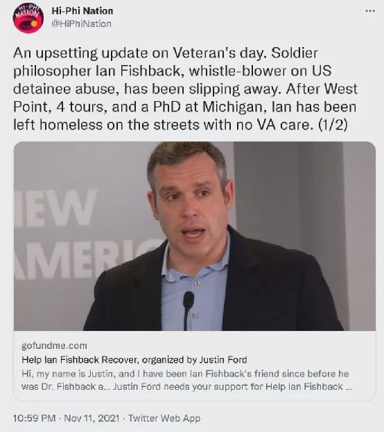 爆料這一消息的賬號稱,這一消息來自費舍拜克的“親朋好友”,并稱他們正在網(wǎng)上發(fā)起“眾籌”,想辦法給這位優(yōu)秀的美軍老兵尋求幫助。