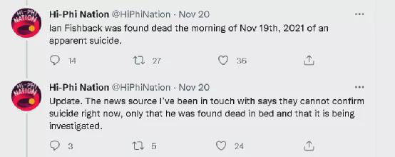 再后來,便是費舍拜克更讓人錯愕的死訊了——其中,根據(jù)那個在11月11日爆料了費舍拜克現(xiàn)狀的社交賬號的說法,他是在11月19日一早被發(fā)現(xiàn)死亡的。