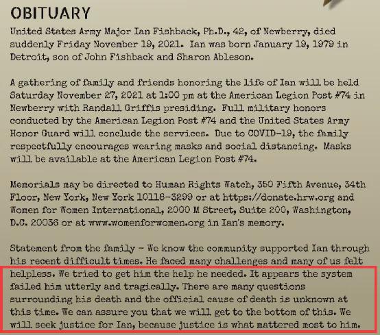 當(dāng)然,最讓人對這名美軍的“吹哨人”的死起疑的,還是他的家屬在他的訃告中寫下的這樣一段聲明: