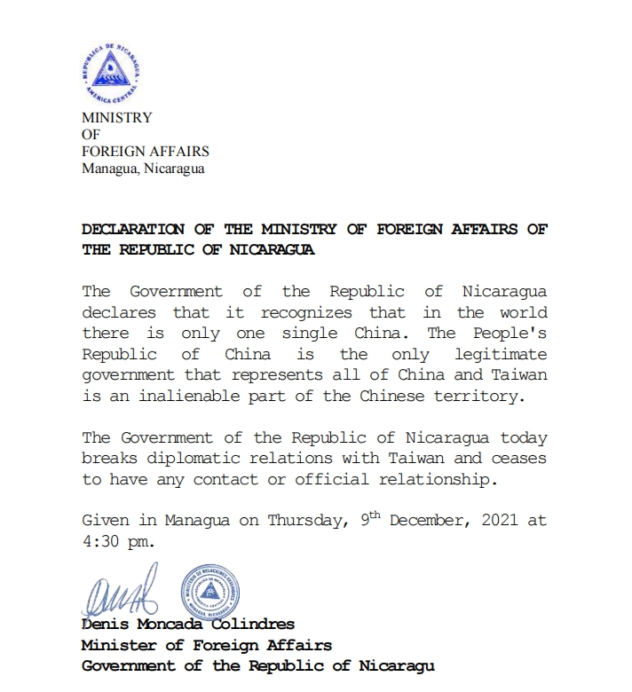 聲明說,世界上只有一個(gè)中國(guó),中華人民共和國(guó)是代表中國(guó)的唯一合法政府,臺(tái)灣是中國(guó)領(lǐng)土不可分割的一部分。尼加拉瓜自即日起斷絕與臺(tái)灣的“外交關(guān)系”并停止與臺(tái)灣的一切接觸和官方聯(lián)系。