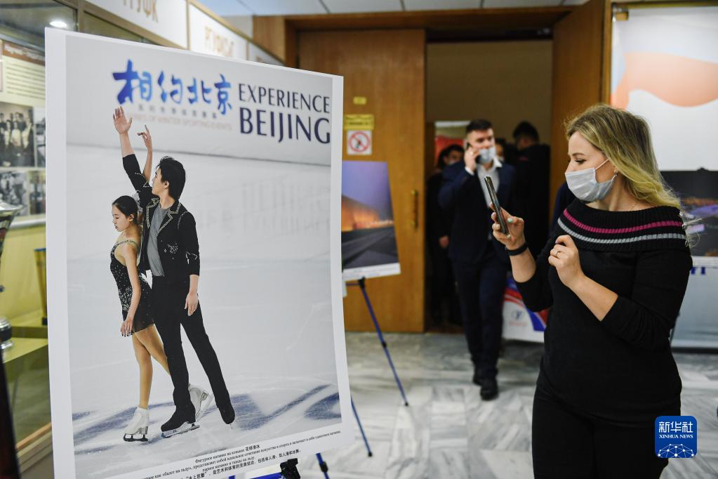 2022年1月21日,一名女子在俄羅斯莫斯科觀看“北京冬奧會,一起向未來”冬奧圖片展。新華社發(fā)(葉甫蓋尼·西尼岑攝)