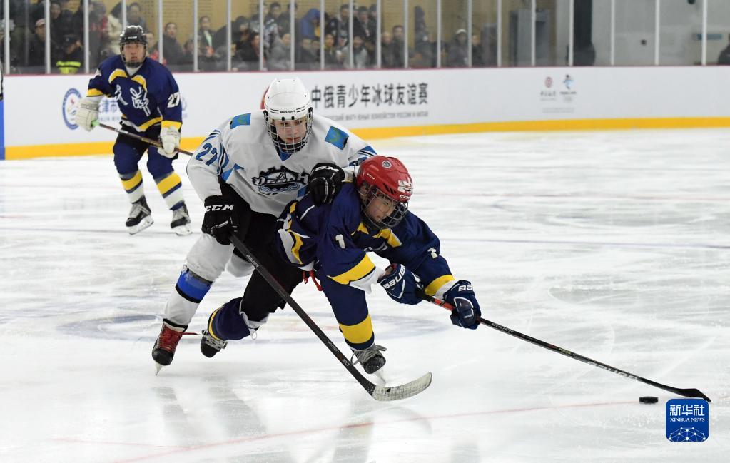 2019年12月10日,中俄雙方隊員在中國天津舉行的第二屆中俄青少年冰球友誼賽中拼搶。新華社記者馬平攝
