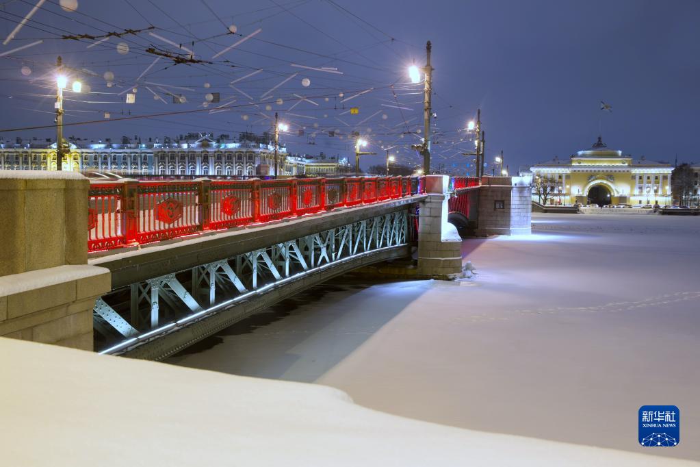 2022年1月31日傍晚,俄羅斯圣彼得堡地標(biāo)性建筑冬宮橋亮起“中國紅”,迎接中國農(nóng)歷虎年春節(jié)的到來。新華社發(fā)(莫京娜 攝)