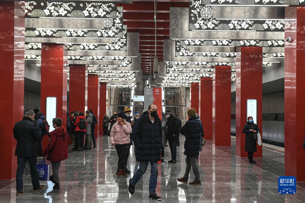 2021年12月7日,在俄羅斯首都莫斯科,乘客走在由中國鐵建承建的莫斯科地鐵第三換乘環(huán)線西南段米丘林大街站內(nèi)。新華社發(fā)(葉甫蓋尼·西尼岑攝)