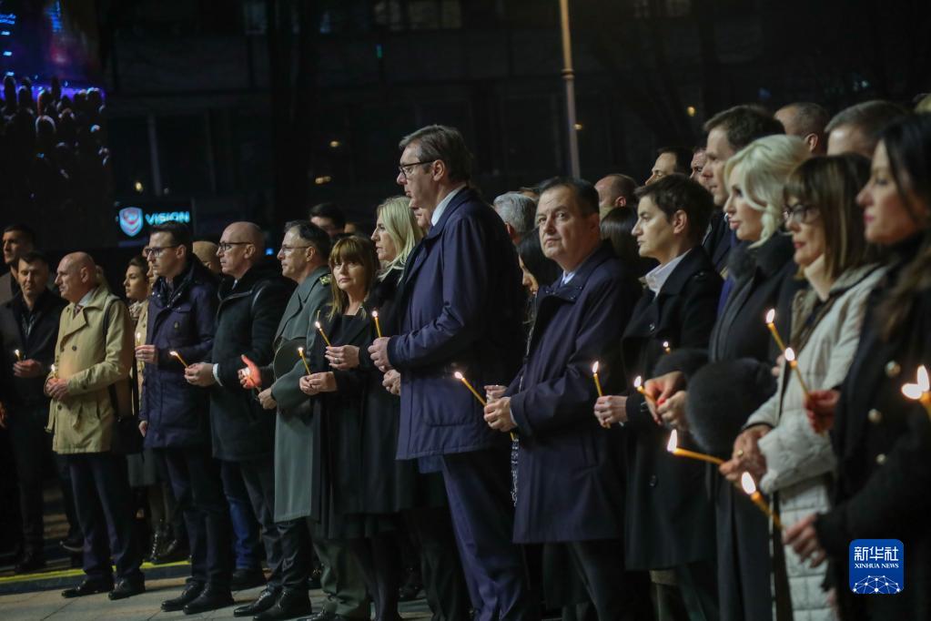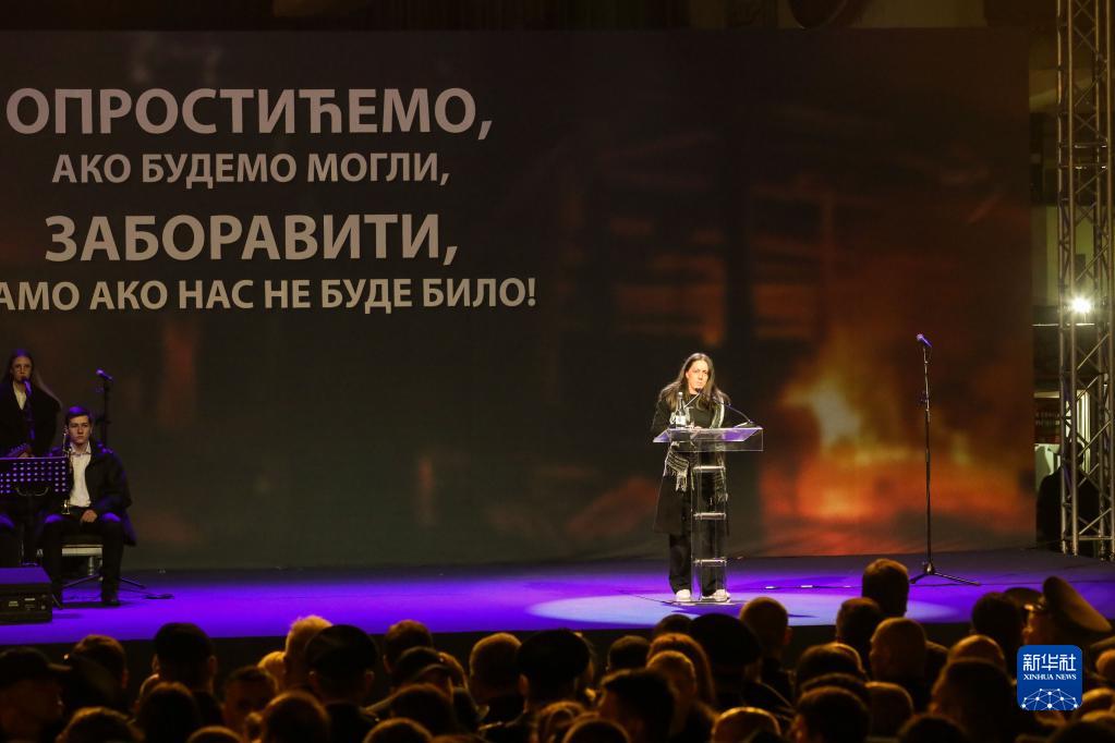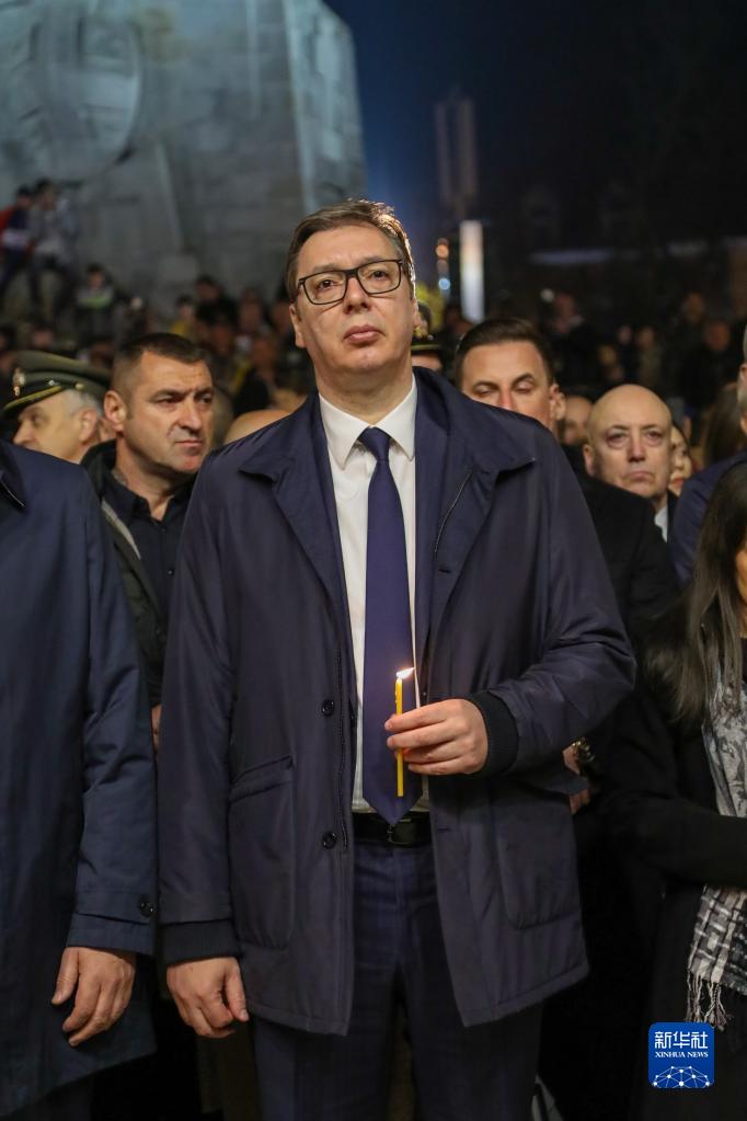 當(dāng)?shù)貢r間晚上8時,悼念儀式開始;顒蝇F(xiàn)場的背景布上用塞爾維亞語寫著:“我們可以原諒,但永遠(yuǎn)不會忘記”。塞爾維亞總統(tǒng)武契奇、議長達(dá)契奇、總理布爾納比奇等出席儀式,他們點(diǎn)燃手中的蠟燭悼念死難者。