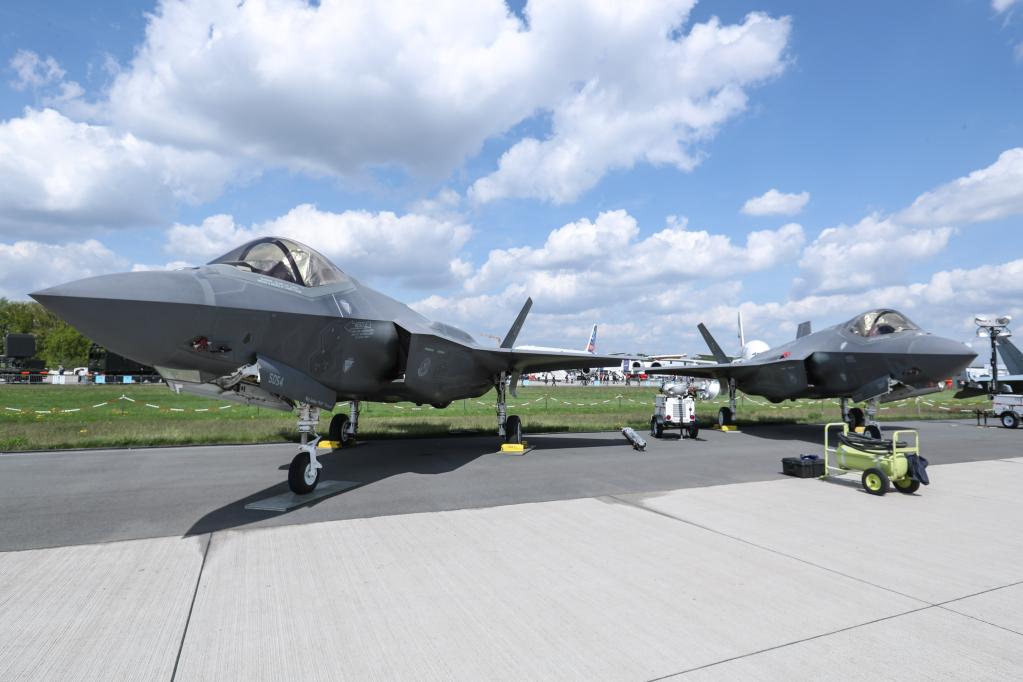 2018年4月27日,在德國(guó)柏林國(guó)際航空航天展上拍攝的“F-35”型戰(zhàn)機(jī)。新華社記者單宇琦攝