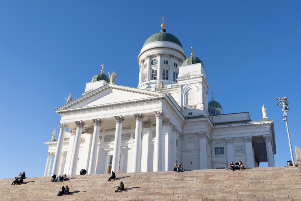 3月16日,人們在芬蘭赫爾辛基大教堂前的臺階上享受暖陽。新華社發(fā)(馬蒂·馬蒂凱寧攝)