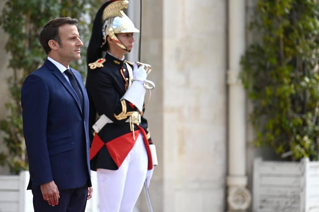 5月7日,在法國巴黎愛麗舍宮,法國總統(tǒng)馬克龍檢閱儀仗隊。(新華社發(fā))