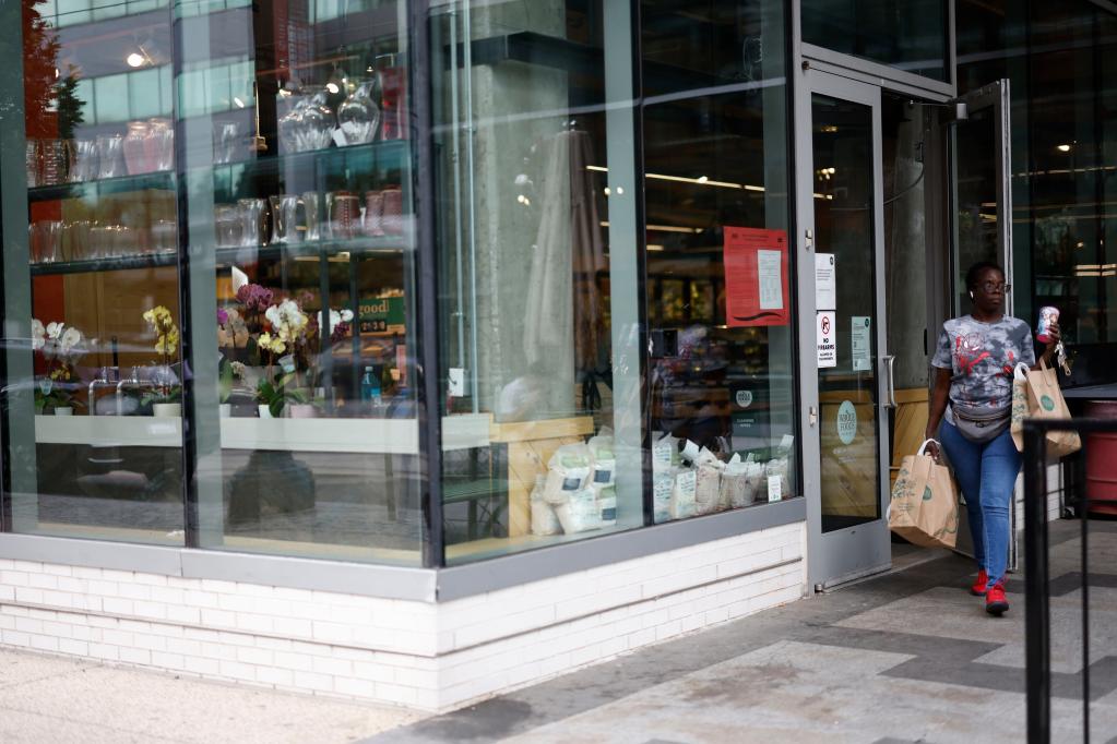 6月14日,在美國華盛頓,一名女子提著購物袋走出一家食品超市。(新華社發(fā),沈霆 攝)