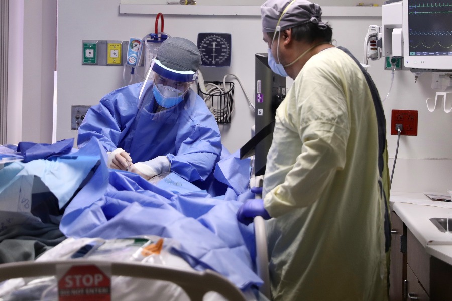 這是2021年1月22日,在美國加利福尼亞州蒙特貝洛市貝弗利醫(yī)院,醫(yī)護人員在“新冠病區(qū)”治療病人。新華社發(fā)