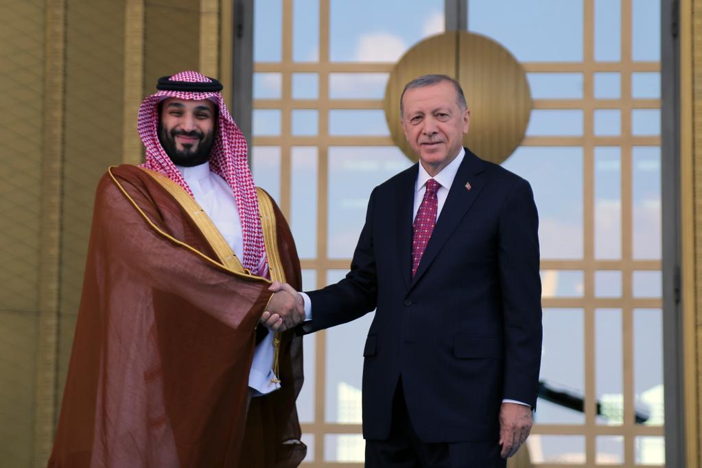 圖為2022年6月22日,土耳其總統(tǒng)埃爾多安(右)在安卡拉迎接到訪的沙特阿拉伯王儲穆罕默德·本·薩勒曼。新華社發(fā)(穆斯塔法·卡亞攝)