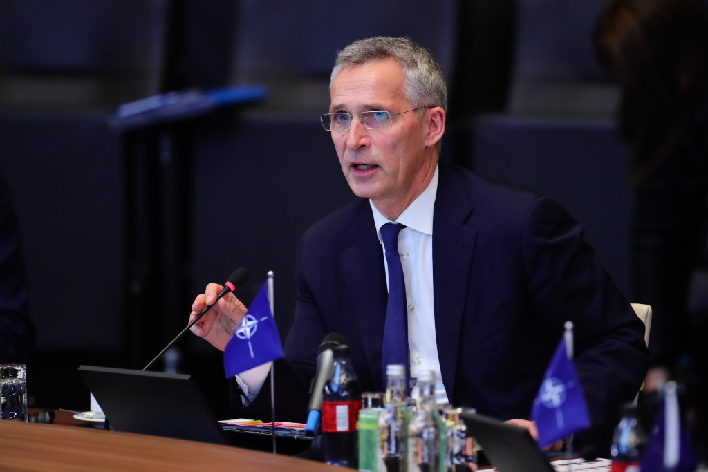 這是2022年4月7日,在比利時布魯塞爾的北約總部,北約秘書長斯托爾滕貝格主持北約外長會的資料照片。(新華社記者鄭煥松攝)