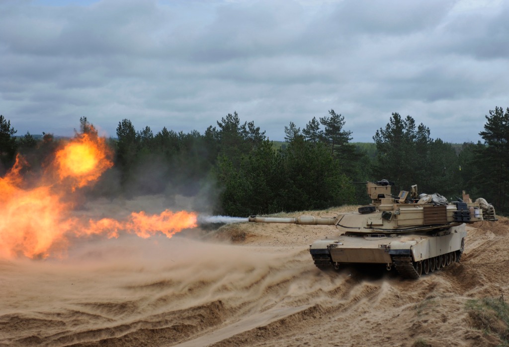 2015年5月7日,在拉脫維亞阿達(dá)日軍事基地靶場(chǎng),一輛美軍“艾布拉姆斯”M1A2主戰(zhàn)坦克進(jìn)行實(shí)彈射擊訓(xùn)練。新華社記者郭群攝