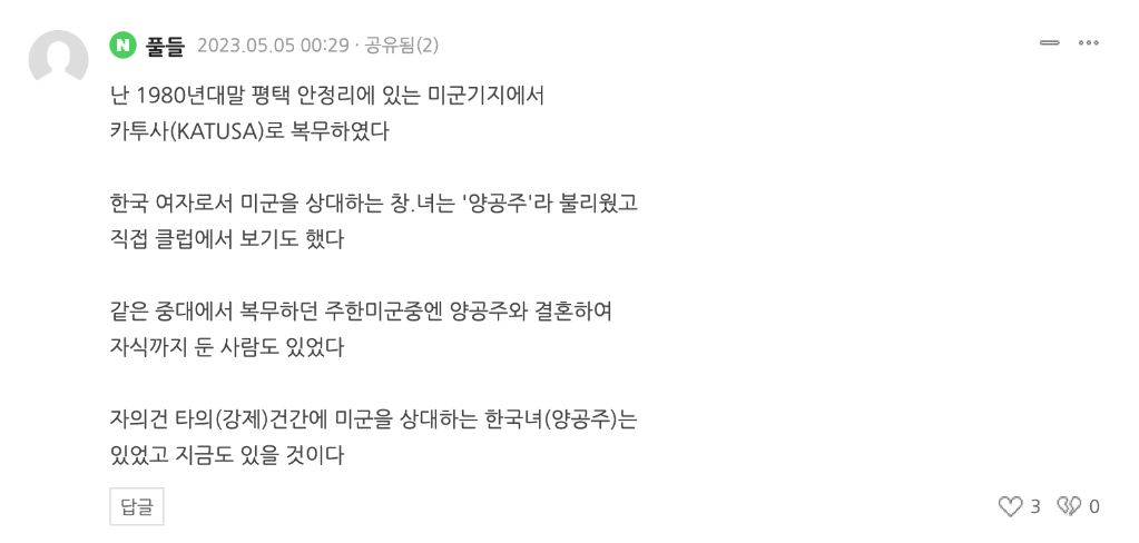 在韓聯(lián)社網(wǎng)站相關(guān)報道的評論區(qū)內(nèi),一名自稱上世紀80年代在駐韓美軍附編韓軍服役過的網(wǎng)友留言道:“我曾在美軍基地俱樂部中親眼見過這些所謂的‘洋公主’,也就是為美軍服務(wù)的韓國性工作者。”